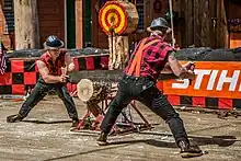 Deux hommes en chemise de bûcheron.