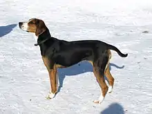 - Race de chien courant, originaire de Finlande, assez grand, à oreilles tombantes, à queue longue, à poil court et lisse, tricolore avec du noir, du blanc et feu.