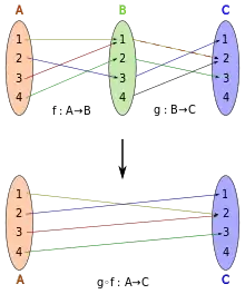 En termes mathématiques, la composition des fonctions est associative, et nous pouvons écrire, par exemple f(gh) = (fg)h où gh est la fonction composite de g et h, et, de même, fg le composite de f et g.