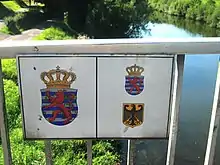 Panneau sur une passerelle franchissant la Sûre, entre le Luxembourg et l’Allemagne. À gauche, territoire luxembourgeois ; à droite, condominium germano-luxembourgeois.