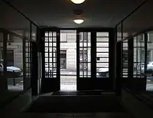 Porte à quatre vantaux dont les croisillons (3), verticaux ou horizontaux, se superposent.