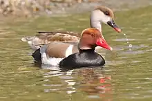 Le dichromatisme sexuel est extrêmement prononcé chez les vrais canards (anatinés). Ici, un couple reproducteur de nettes rousses (Netta rufina); le mâle est à l'avant-plan.