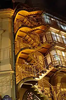 — (Alexandre Dumas, Le Comte de Monte-Cristo, 1845, chapitre 45.)Le duc, […], atteignit enfin un escalier en spirale pratiqué dans l’épaisseur d’un mur et qui s’ouvrait par une porte secrète et invisible dans l’antichambre de l’appartement de Marguerite.