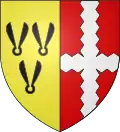 - Parti, au premier d’or à trois forces de sable ; au second de gueules à la croix dentelée d’argent, qui est de la commune d’Argentre de Mayenne → voir illustration « armoiries avec 3 forces »