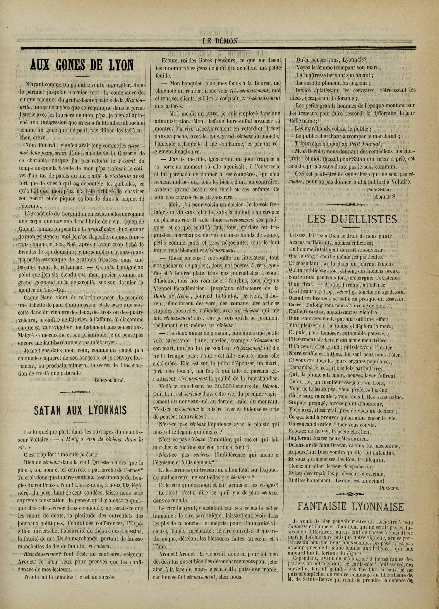 — (Guignol aîné, Aux gones de Lyon, Le Démon, première année, n° 4, 06/07/1867, page 3)Aussi, ça m’a donné l’idée d’un trancanage pour arquepincer ce grand gognand que nous embête depuis si longtemps. Faut proposer un dépontèlement des armées de la guerre de toutes les Uropes, gn’aura plus de sordats melitaires, en Prusse comme ailleurs. Y restera que moi, avé ma trique, bien entendu.