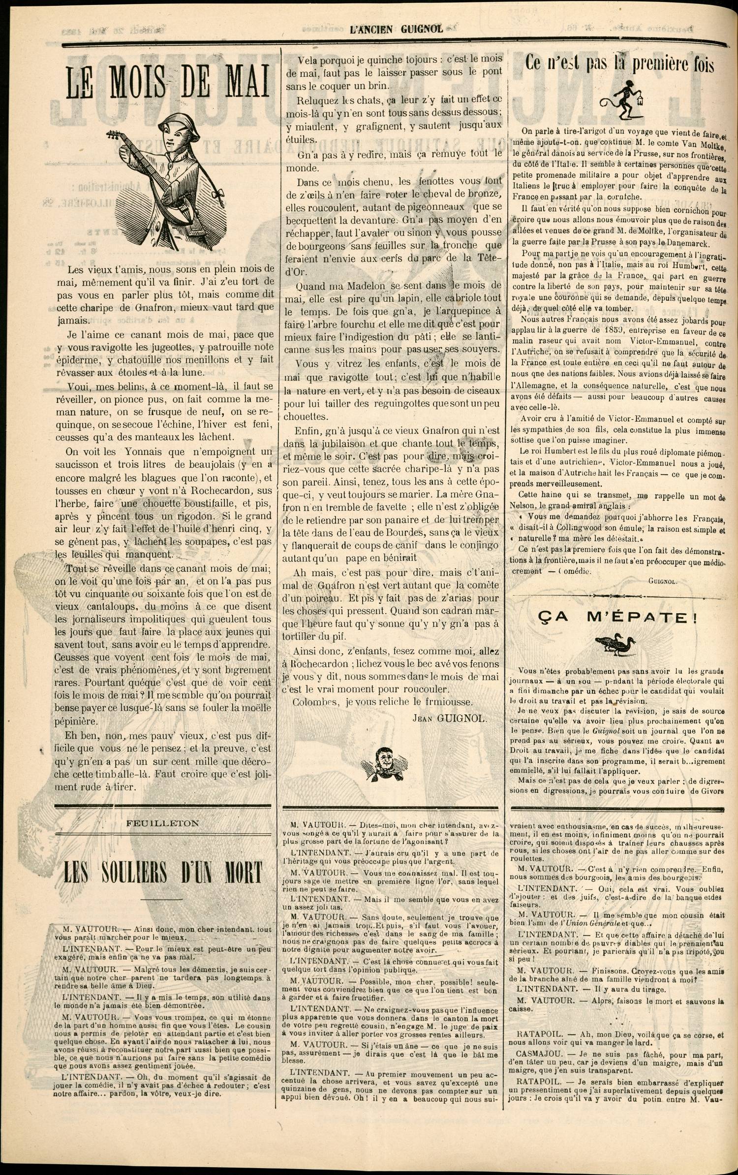 — (Jean Guignol, Le mois de mai, L’ancien Guignol, 26/05/1883, page 2)— Une petite purgation ferait du bien à monsieur! Cinquante télégrammes d’huile d'Henri cinq, par exemple ?