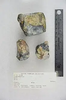 Les proportions de titane, niobium et tantale révélées par l’analyse chimique ne peuvent s’expliquer que par l’existence des minéraux suivants : euxénite (ou autre niobotantalate d'urane et de terres rares), ilménite, niobite ou ilménorutile.