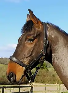 - (Équitation) Lien de cuir, de corde ou de crin, qu’on met autour de la tête des chevaux, des mulets et d’autres bêtes de somme, pour les attacher au moyen d’une ou deux longes au râtelier, à l’auge, etc.