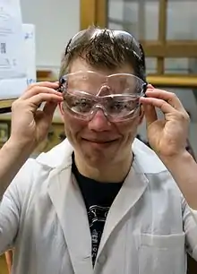 Un scientifique qui se protège bien les yeux grâce à de multiples paires de lunettes de sécurité.
