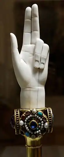 - (Histoire) Sorte de sceptre que le roi portait le jour de son sacre et dans les grandes cérémonies, au haut duquel était la figure d’une main, emblème de la puissance.