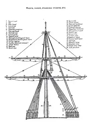Un grand mât de marine à voile classique avec toutes ses manœuvres dormantes, et ses deux grandes vergues (espars transverses de support des voiles). Dictionnaire nautique illustré de Howard Patterson (1891).