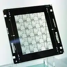 - (Industrie) Plaque avec des zones transparentes ou évidées et des zones opaques, laissant passer la lumière en photolithographie.