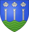 - D’azur, aux trois colonnes d’argent à chapiteau corinthien surmontées de trois coquilles du même et mouvant d’une mer de sinople, qui est de la commune de Saint-Aubin-sur-Mer du Calvados → voir illustration « armoiries avec une mer »