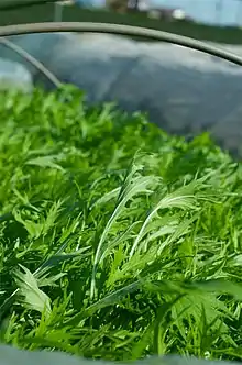 Le mizuna est une plante bisannuelle à feuillage vert foncé de forme découpée, originaire des zones maritimes du nord de la Chine, de Corée et du Japon. Cette plante de la famille du chou fait partie, avec les moutardes, le mibuna, le komatsuna, le tah-tsaï, et bien d’autres variétés, du grand choix de légumes que l'on trouve sur les étals des marchés en Asie.