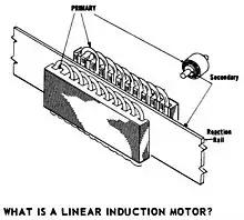 - (Électrotechnique, Mécanique) Moteur électrique asynchrone qui a la particularité d'avoir un rotor et un stator « déroulés », à plat, de produire ainsi un champ électromagnétique linéaire et une force de translation et non un couple.