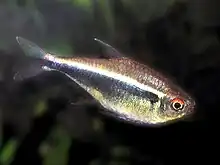 - (Ichtyologie) Petit poisson à reflets noirs avec une bande latérale d’un blanc vif, originaire du bassin du Rio Paraguay au Brésil, fréquemment élevé en aquariophilie.