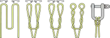 Le nœud de gueule de raie. Ce nœud appartient à la famille des nœuds de croc. En s'effectuant sur un milieu de cordage, les deux brins partent de part et d'autre du nœud.