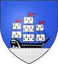 - D’azur au navire contourné de trois mâts de sable, habillé d’hermine, flammé de gueules et voguant sur une mer d’argent, qui est de la commune d’Hennebont du Morbihan → voir illustration « armoiries avec un navire »
