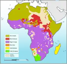 Carte des familles de langues d’Afrique, les régions où les langues nigéro-congolaises sont parlées sont en mauve.