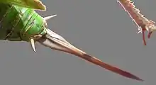 - (Entomologie) Prolongement de l’abdomen de certains insectes, à l’aide duquel les femelles font des trous pour loger leurs œufs.