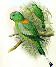 - Perruche d'Indonésie, du genre Prioniturus, de taille modeste, très proche de la palette de Cassin mais avec de l'orange en haut du dos du mâle.