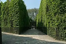 - Toute la cour marcha le long de l'allée , sans s’apercevoir du lieu où elle étoit ; mais comme elle eut fait plus de la moitié du chemin, il y eut une palissade de verdure, s’ouvrant tout d’un coup de part & d’autre, laissa voir, au travers d'un grand portique, un salon rempli d'une infinité de lumières , & une longue allée au-delà, dont l’extraordinaire beauté surprit tout le monde.— (M. Bret Œuvres de Molière, avec des remarques grammaticales, tome 5, Paris, 1804, p.339)