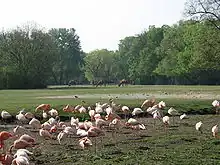 Flamants et dromadaires dans un parc animalier.