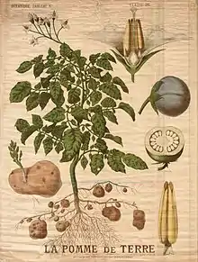 - « Pomme de terre » est une expression figée, calquée sur le latin malum terrae, qui est attestée en français depuis 1488 pour désigner diverses plantes à tubercules ou bulbes[1]. Elle a désigné ensuite le topinambour sous l’influence du néerlandais aardappel, littéralement « pomme de terre ». Par la suite, le topinambour a pris son nom actuel à la suite de l’exhibition à Paris d’Amérindiens de la tribu des Tupis, et le nom "pomme de terre" a été définitivement appliqué à Solanum tuberosum, tubercule popularisé notamment par Antoine Parmentier à partir de 1773.