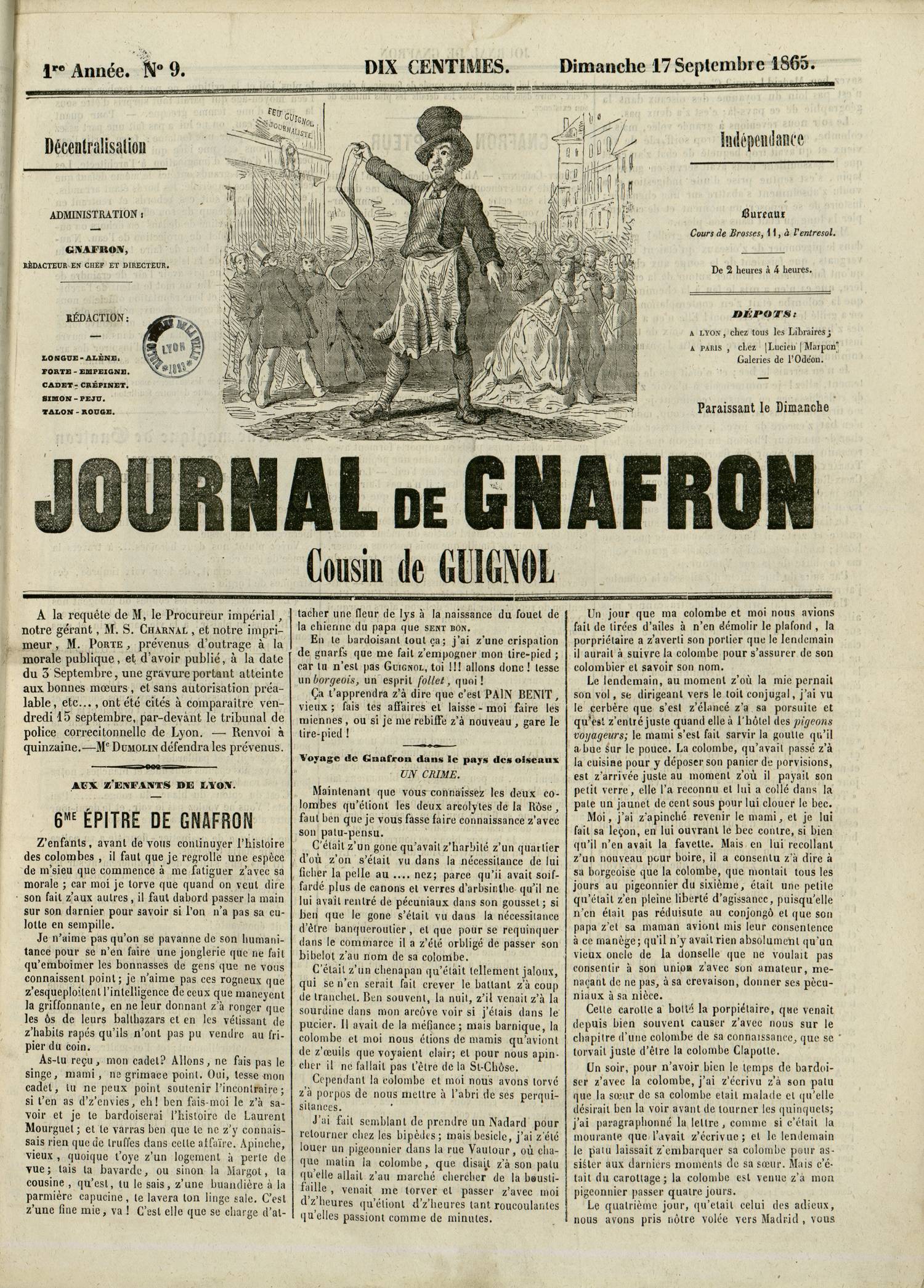 - Ben souvent, la nuit, z’il venait z’à la sourdine dans mon arcôve voir si j’étais clans le pucier. Il avait de la méfiance; mais barnique, la colombe et moi nous étions de mamis qu'aviont de z’oeuils que voyaient clair; et pour nous apincher il ne fallait pas l'être de la St-Chôse. — (Voyage de Gnafron dans le pays des oiseaux : Un crime, Journal de Gnafron, numéro 9, 17/09/1865, page 1)