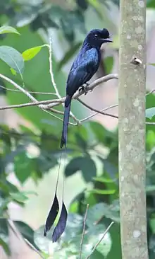 Le drongo à raquettes (5) (Dicrurus paradisaeus) fournit un exemple remarquable du type de spécialisation du plumage comme "pièce d'ornementation" que fournissent ces rectrices spécialisées qui contribuent aux différentes caractéristiques sexuelles secondaires du mâle.