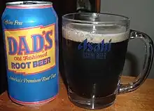 Une cannette et un verre de root beer.
