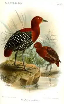 - (Zoologie) (Soutenu) Tout oiseau de la famille des sarothruridés, famille récemment créée d’oiseaux néognathes échassiers de l'ordre des gruiformes, connues sous le nom de râles-nains (ou de râles selon la convention qui précédait la refonte taxinomique) dont toutes les espèces sont propres à l'Afrique, et qui regroupe douze espèces qui étaient classées auparavant dans la famille des rallidés et qui présentent des caractéristiques distinctes, relevant principalement de l'ordre de la phylogénie moléculaire.