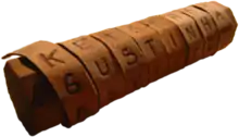 - Encodage dont se servaient les Lacédémoniens pour écrire des lettres chiffrées, et qui consistait en ceci : on prenait deux rouleaux de bois de grosseur égale, dont les deux correspondants avaient chacun le sien ; celui qui voulait mander quelque chose de secret tortillait autour de son rouleau une lanière de parchemin, sur laquelle il écrivait ce qu'il voulait faire savoir à l'autre, qui, ayant reçu cette lanière, la tortillait aussi sur son rouleau et trouvait tout d'un coup les mots et les lignes dans leur ordre naturel.