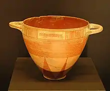 - (Antiquité) Vase à boire (gobelet), avec deux anses sur le côté.