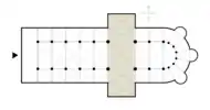 — (Joris-Karl Huysmans, La Cathédrale, Plon-Nourrit, 1915)[…] ; la forme de l’église est celle de la basilique ancienne à croix latine, au transept visible seulement par les voûtes ; […].