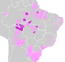 Répartition actuelle des langues tupi (violet) et des langues tupi-guarani (rose), et extension supposée du tupi-guarani dans le passé (gris-rose).