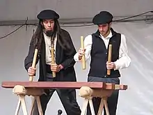 - (Musique) Instrument de musique basque à percussion composé de un ou plusieurs bouts de bois posés sur des paniers renversés et de quatre makilaks tenus par deux joueurs.