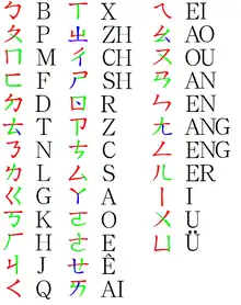 - Du chinois 注音, zhùyīn, composé de 注, zhù (« annoter ») et de 音, yīn (« son »). Abréviation de 注音符好 (zhùyīn fúhǎo).