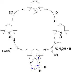 Le TEMPO est utilisé en synthèse organique comme catalyseur pour l'oxydation d'alcools primaires en aldéhydes et d'alcools secondaires en cétones. L'oxydant effectif est le cation N-oxoammonium issu de l'oxydation du TEMPO par un co-oxydant (par exemple l'acide hypochloreux présent dans une solution d'hypochlorite de sodium) consommé en quantité stœchiométrique. L'ensemble du processus d'oxydation réalise un cycle catalytique. Le schéma suivant illustre la situation dans le cas de l'oxydation d'un alcool primaire en milieu fortement basique :