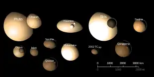 −225 km en supposant une vue équatoriale et un albédo de 0,089[25],[6]. Cette valeur aurait fait de Gonggong le troisième plus gros transneptunien connu, derrière Pluton et Éris mais devant Makémaké[6],[32]. Ces observations de Gonggong faisaient partie de la mission K2, qui comprenait l'étude de petits corps du système solaire[32]. Des mesures ultérieures, en 2018, révisèrent l'estimation de la taille de Gonggong à la baisse avec une valeur de 1 230 ± 50 kilomètres, basée sur la masse et la densité de Gonggong dérivées de l'orbite de son satellite et la découverte qu'on a une vue presque polaire de Gonggong[26]. Avec cette nouvelle estimation, Gonggong retrouve la cinquième place parmi les plus gros objets transneptuniens connus[26].