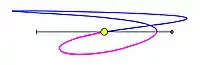 Le deuxième diagramme montre une orbite complète d'astéroïde Kaʻepaokaʻawela, dans un système de référence lié à Jupiter. La vue est de côté, par rapport au plan de l'écliptique. Le Soleil est le disque jaune au milieu. Le plan de l'orbite de Jupiter est représenté en noir, mais dans ce cadre de référence, Jupiter (le point rouge) reste à l'extrémité droite de la ligne noire. L'orbite de cet astéroïde est montrée en bleu quand elle est au-dessus (au nord) du plan de l'orbite de Jupiter, et elle est montrée en magenta quand elle est au-dessous (au sud du plan de l'orbite de Jupiter.