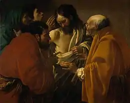 L'École caravagesque d'Utrecht est un important groupe d'artistes qui réalisent des peintures d'histoire et de grandes scènes de genre dans un style italianisant, et qui font souvent une grande utilisation du clair-obscur. Utrecht, qui était avant la révolte des gueux la ville la plus importante du pays, présente alors la caractéristique exceptionnelle de compter une population catholique d'environ 40 % au milieu du siècle, et plus encore parmi les milieux les plus aisés. On peut compter parmi les peintres catholiques néerlandais du XVIIe siècle Abraham Bloemaert, Gerrit van Honthorst, Jan Steen et Paulus Bor, ainsi que Vermeer qui s'était probablement converti à son mariage[17]. Les principaux représentants de cette école sont Hendrick ter Brugghen, Gerrit van Honthorst et Dirck van Baburen, et l'école est active jusque vers 1630, même si van Honthorst continue sa brillante carrière dans les cours anglaise, néerlandaise et danoise jusqu'en 1650, bien que dans un style plus classique[18].