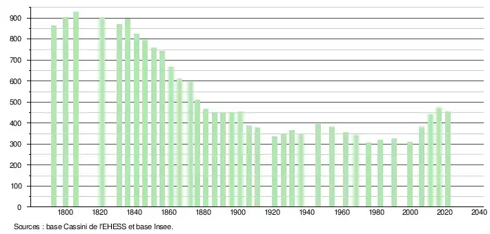 L'évolution du nombre d'habitants est connue à travers les recensements de la population effectués dans la commune depuis 1793. Pour les communes de moins de 10 000 habitants, une enquête de recensement portant sur toute la population est réalisée tous les cinq ans, les populations légales des années intermédiaires étant quant à elles estimées par interpolation ou extrapolation[21]. Pour la commune, le premier recensement exhaustif entrant dans le cadre du nouveau dispositif a été réalisé en 2006[22].