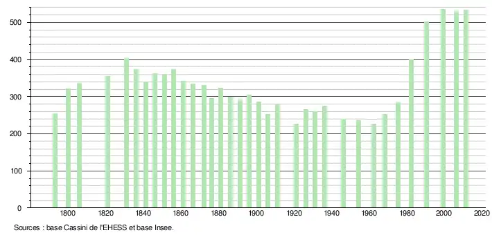 L'évolution du nombre d'habitants est connue à travers les recensements de la population effectués dans la commune depuis 1793. À partir du , les populations légales des communes sont publiées annuellement dans le cadre d'un recensement qui repose désormais sur une collecte d'information annuelle, concernant successivement tous les territoires communaux au cours d'une période de cinq ans. Pour les communes de moins de 10 000 habitants, une enquête de recensement portant sur toute la population est réalisée tous les cinq ans, les populations légales des années intermédiaires étant quant à elles estimées par interpolation ou extrapolation[5]. Pour la commune, le premier recensement exhaustif entrant dans le cadre du nouveau dispositif a été réalisé en 2006[6],[Note 1].