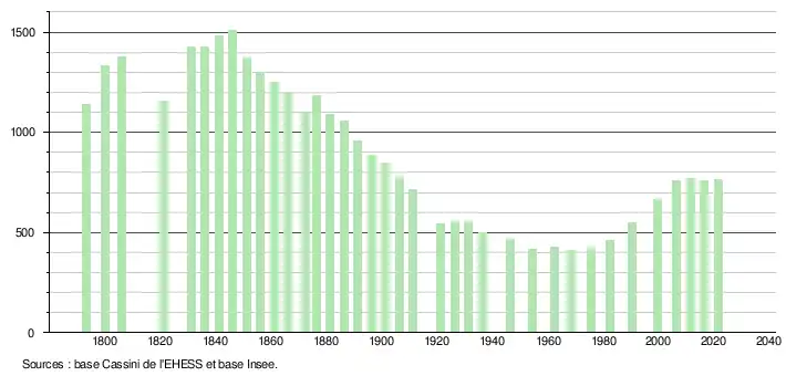 L'évolution du nombre d'habitants est connue à travers les recensements de la population effectués dans la commune depuis 1793. Pour les communes de moins de 10 000 habitants, une enquête de recensement portant sur toute la population est réalisée tous les cinq ans, les populations légales des années intermédiaires étant quant à elles estimées par interpolation ou extrapolation[19]. Pour la commune, le premier recensement exhaustif entrant dans le cadre du nouveau dispositif a été réalisé en 2006[20].