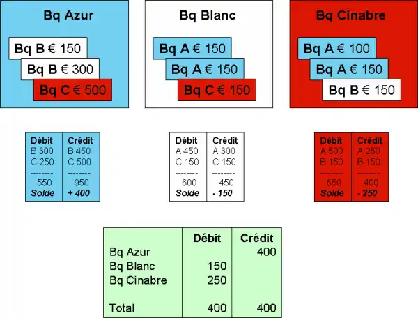 L'exemple repose sur un système interbancaire d'échange de chèques entre trois banques : Azur, Blanc et Cinabre. Ce système, après compensation multilatérale, se règle dans les livres d'un tiers, agent de règlement pour ce système.