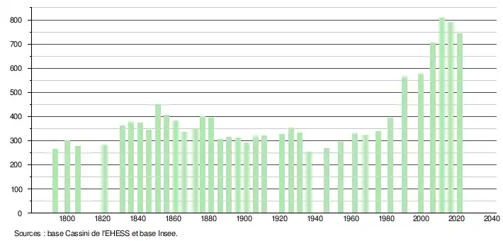 L'évolution du nombre d'habitants est connue à travers les recensements de la population effectués dans la commune depuis 1793. Pour les communes de moins de 10 000 habitants, une enquête de recensement portant sur toute la population est réalisée tous les cinq ans, les populations légales des années intermédiaires étant quant à elles estimées par interpolation ou extrapolation[52]. Pour la commune, le premier recensement exhaustif entrant dans le cadre du nouveau dispositif a été réalisé en 2006[53].