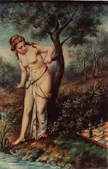 Selon une autre légende, inventée par le poète anglais William Jones en 1763 dans un poème en latin, Euphron (frère de Vénus et dieu des sports) aurait créé les échecs pour aider Mars à séduire la belle Caïssa[13]. Cette dernière est parfois considérée comme la déesse des échecs.