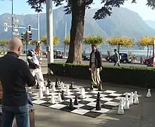Les échecs (prononcé : /e.ʃɛk/), ou le jeu d'échecs, sont un jeu de société de type jeu de guerre[1], opposant deux joueurs de part et d'autre d'un tablier appelé « échiquier » composé d'une grille carrée dessinant soixante-quatre cases, alternativement claires et sombres, nommées les cases blanches et les cases noires. Sur l'échiquier sont disposées au plus trente-deux figurines, appelées pièces, représentant deux armées ennemies. Il y a seize pièces de couleur claire pour le camp dit des blancs, et seize pièces de couleur foncée pour le camp dit des noirs. Les joueurs jouent à tour de rôle en déplaçant de case en case l'une de leurs pièces (ou deux pièces en cas de roque). Chaque joueur possède au départ un roi, une dame, deux tours, deux fous, deux cavaliers et huit pions. Ces différentes pièces obéissent à des règles propres quant à leurs déplacements possibles. À chaque tour, une pièce, en se déplaçant, est susceptible de le faire en terminant sur une case occupée par une pièce adverse, qui est alors retirée du jeu. Quand un tel coup est possible au prochain tour, la pièce adverse en question est dite en prise. Quand c'est l'un des rois qui est en prise, on dit alors qu'il y a échec. Le but du jeu est d'infliger à son adversaire un échec et mat, c'est à dire un échec imparable.