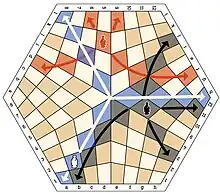 Par rapport au jeu d'échecs classique, on remarque une particularité intéressante : c’est qu'après le franchissement d'une case centrale il peut y avoir un choix entre deux directions possibles, car le sommet d'une case centrale correspondant au centre de l'échiquier est en contact avec le sommet de deux cases ayant la même couleur.